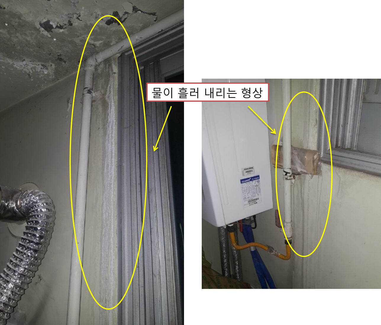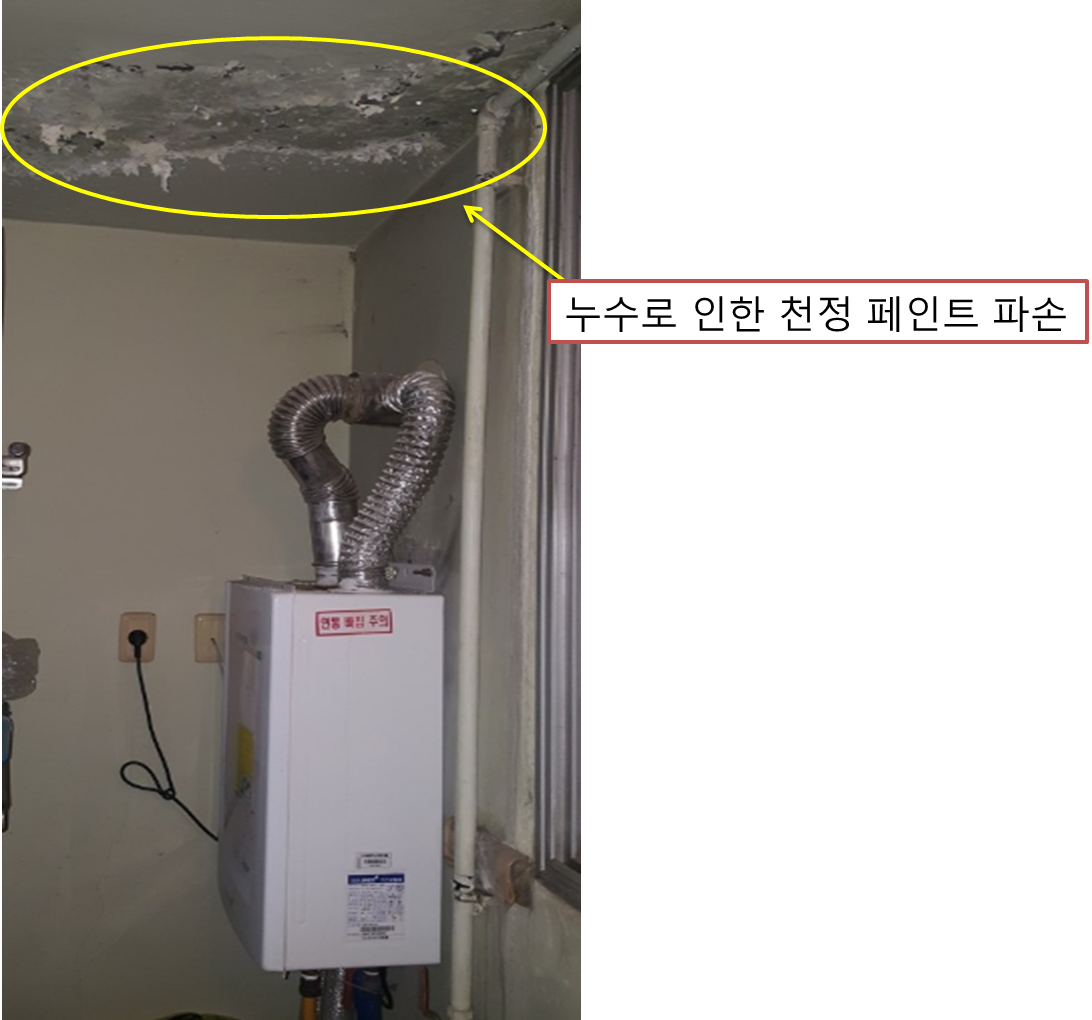 위 왼쪽 사진으로 판단했을 때 이번이 처음 일어나는 일이 아니라 외부 빗물이든, 보일러 고장에 의한 누수든