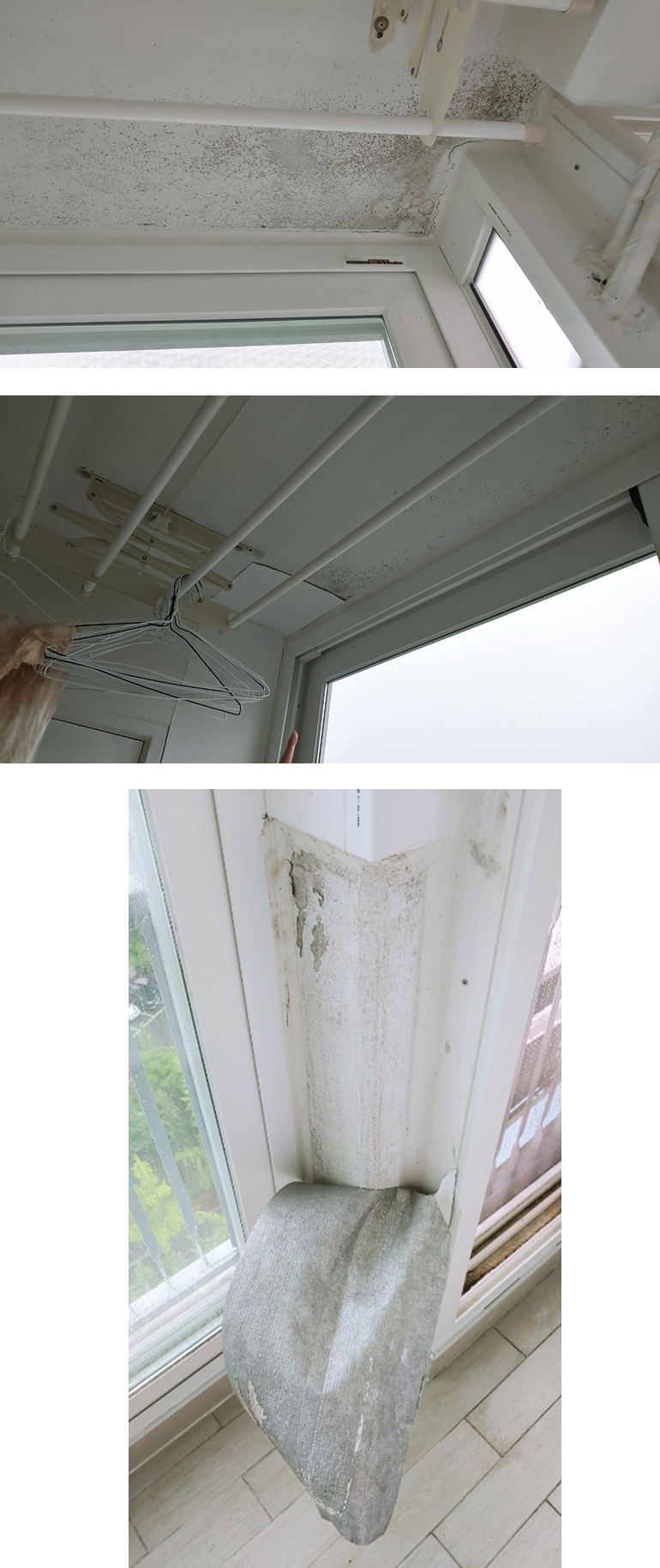 우선 곰팡이가 핀 부분의 외부 쪽 실리콘 파손 여부를 확인해 보세요.