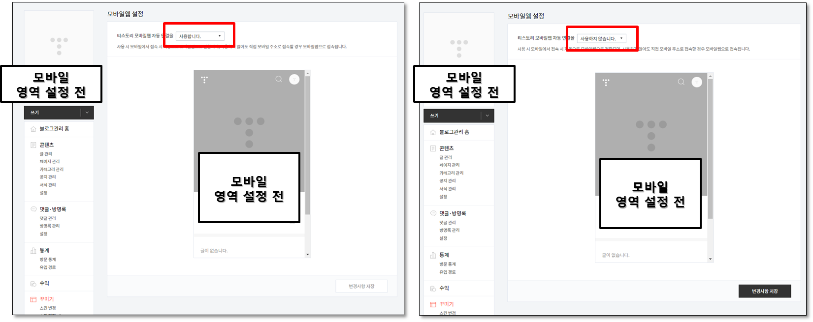 4-2 꾸미기 영역의 모바일 설정에서 "티스토리 모바일 웹 자동 연결을 사용하지 않습니다"로 설정한다.