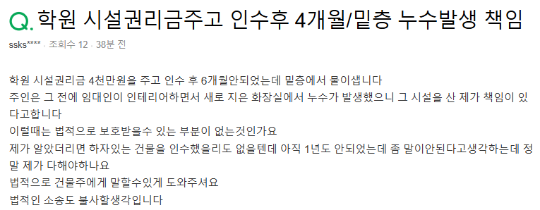 학원을 인수한 지 얼마 되지 않았는데 누수 문제가 발생했다니 정말 당황스러우시겠어요.