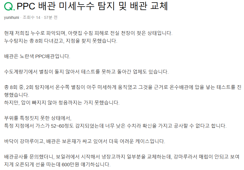 - 위 내용을 검토했으나 여전히 수도나 난방 배관 누수라는 결론이 나온다고 배관의 일부분 교체를 생각해야 한다면 다른 업체도 검토해 보시길 제안드립니다.